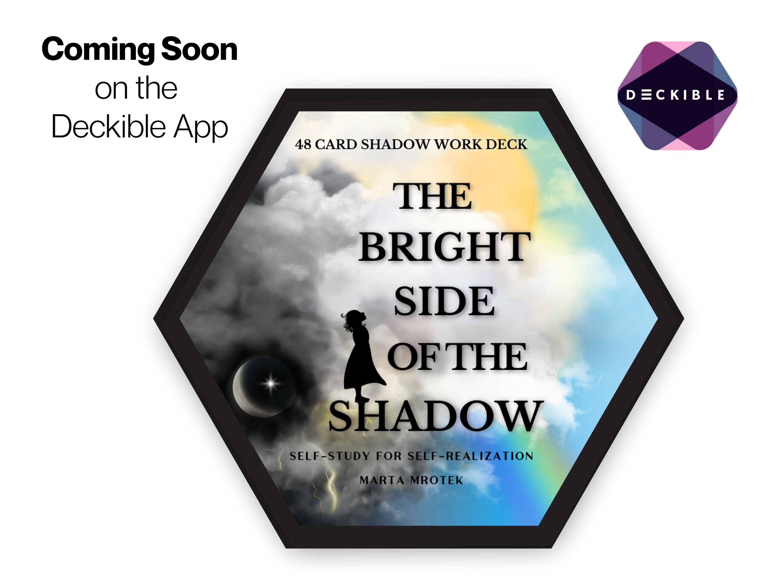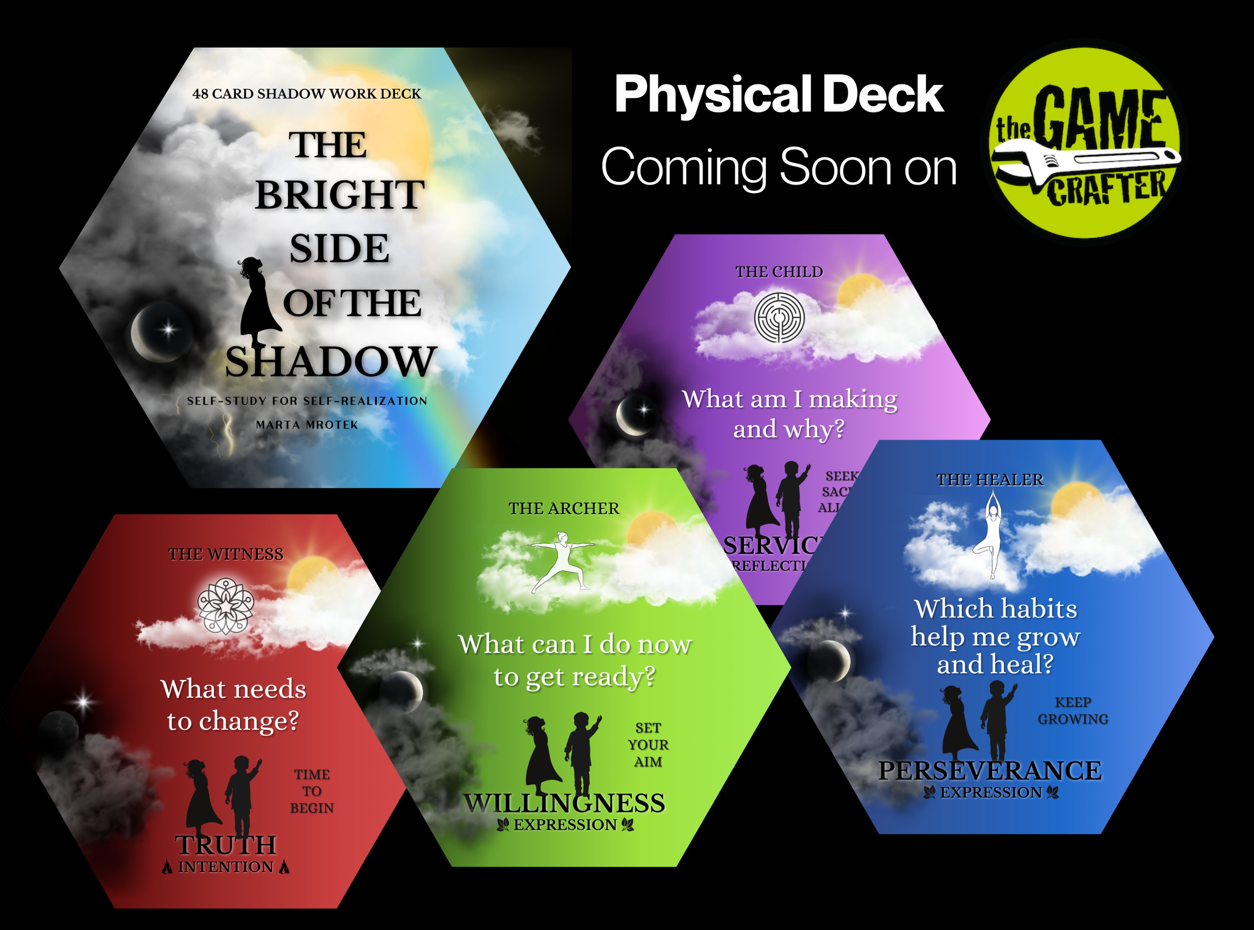 Coming Soon! The Bright Side of the Shadow can be used as a journaling tool and a prompt for asking yourself the questions that heal. At 3.75 inches, these hexagon cards are still easy to shuffle and easy to read as a backdrop for any layout or spread, or as a daily source of single-card inspiration. This special deck was created as a companion to the full-length text coming out in 2026, and a valuable template for any of the other decks in the Self-Study for Self-Realization Series. It can be used to add a layer of self-study to any reading or as a standalone practice deck. Explore the lighter aspects of shadow work with the principles and their archetypes as advisors for the inner child, always asking the questions that look for the bright side and all of the good things that are already there just below the surface.